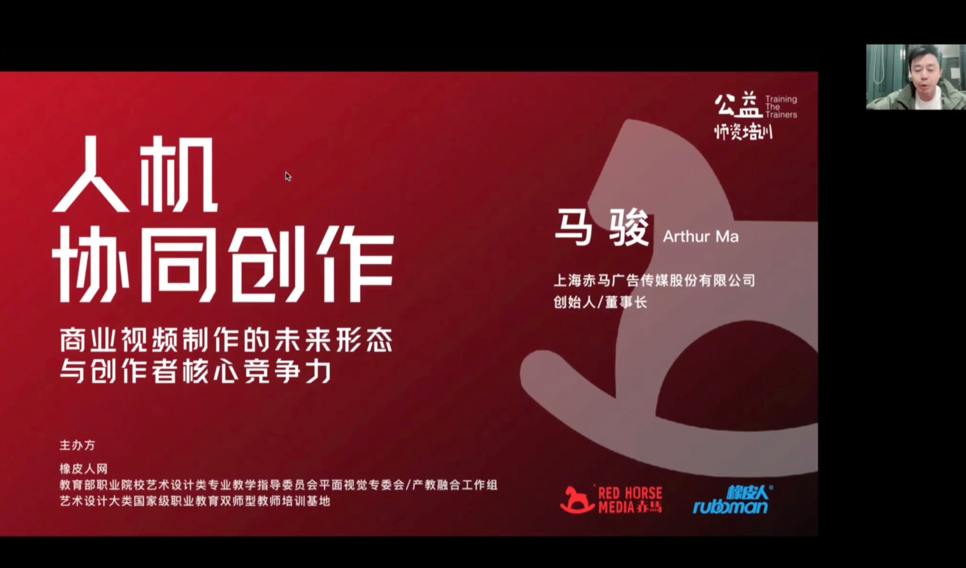 本年度第7期公益师资培训,我们很荣幸地邀请到了上海赤马广告传媒股份有限公司创始人/董事长马骏老师,为院校老师们带来一堂关于当今广告影视制作流程及如何与AI工具协同工作的培训,主题为《人机协同创作》。